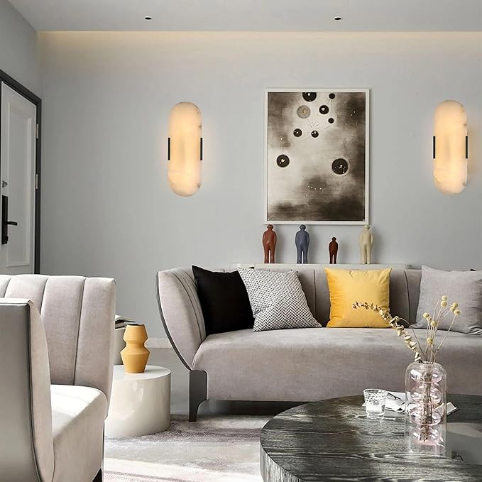 2 Pack 2 Light Natural Oval Alabaster Marble Bathroom 15 Inch Wall Sconce Modern Concise Style Wall Light Fixtures,Dark Gray Finish for Bedroom Hallway Bedside Living Room