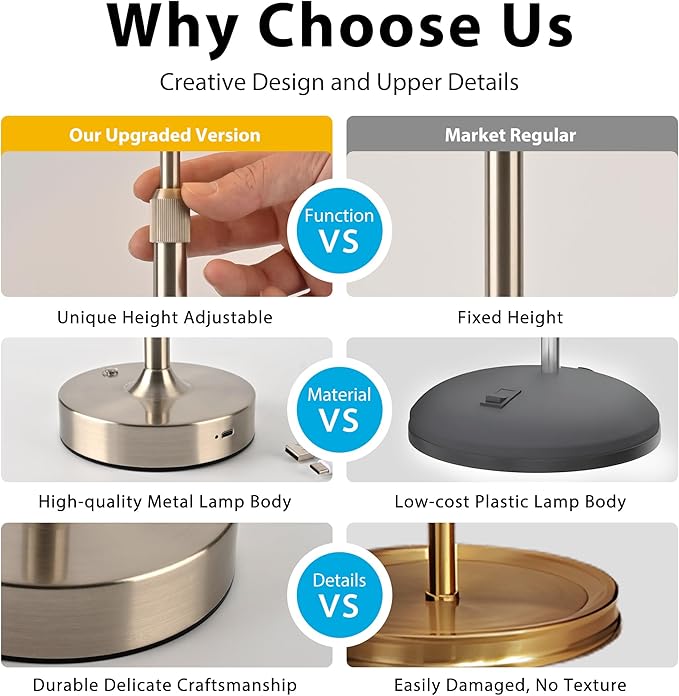 - Unique Height Adjustment Function: The special battery powered table lamp has a height adjustment function, you can adjust the height according to the use scene or demand, the height of the wireless lamp can be adjusted between 13.8 inches and 16.5 inches.
