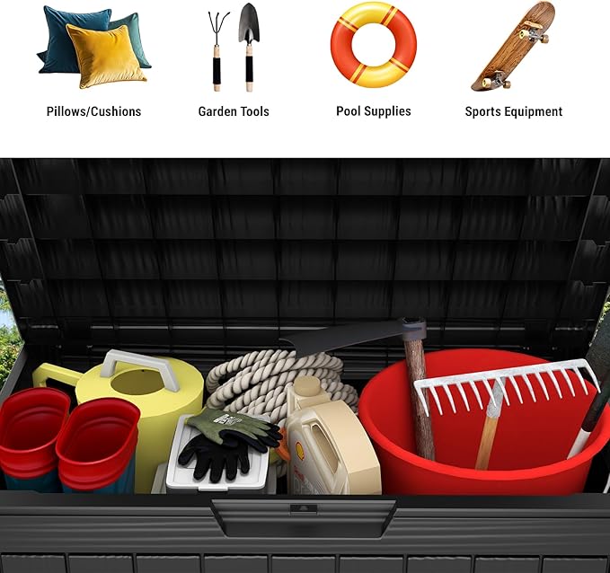 - 【Note】- For best protection, always keep the lid securely locked during rainy or windy weather to prevent hinge damage and contents from getting wet, please carefully compare the internal dimensions of the storage box with the size of your items to ensure a proper fit