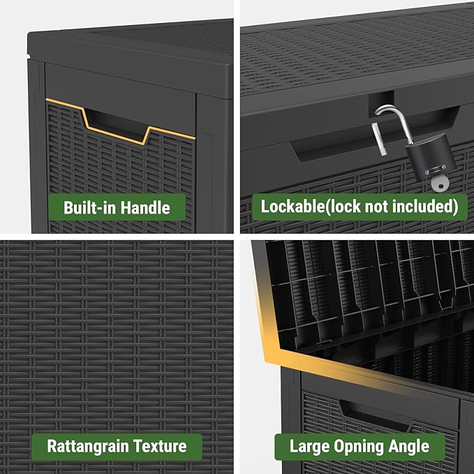 - 【Built to Withstand Any Weather】- Constructed from premium PP resin with an elegant woodgrain finish, this deck box is UV-resistant and waterproof, ensuring that your belongings stay protected and dry year-round in any weather like rain, sun, and seasonal changes, requires minimal maintenance and guarantees long-lasting performance