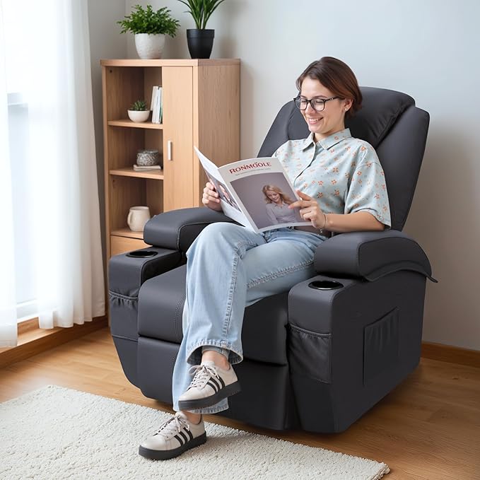 - Ergonomic Design: Classic appearance, can be placed in every room. The PU leather surface, wear-resistant and easy to clean. Equipped with two side pockets and two cup holders, magazines and cups can be placed, making everything within reach.