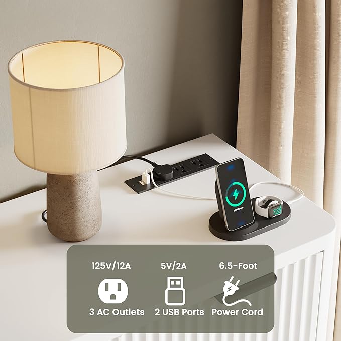 - Dresser with Built-in Power Outlets - This fluted drawer dresser features 3 AC outlets and 2USB ports, allowing for simultaneous charging of your mobile phone, headphones, smartwatch, or laptop. With a convenient 6.5-foot power cord, you can easily position the dresser wherever it fits best in your room