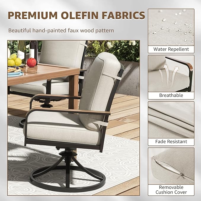 - 360° SWIVEL & ROCKING: These outdoor patio dining sets feature a 360-degree rotation and gentle rocking motion design. This allows you to rotate in any direction as needed, making it more convenient to chat with family while enjoying meals. The 15-degree gentle rocking motion provides an ideal relaxation experience.