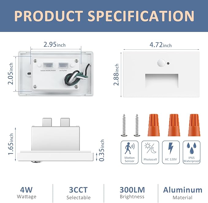 - DURABLE & COMPACT DESIGN: These motion activated led stair lights feature a sleek rectangular shape, sturdy aluminum body, 4W power, 300LM output, and 120V input hardwired, no need of transformer. Sized at 4.72" x 2.88", they’re ideal stairway lights for modern indoor and outdoor use