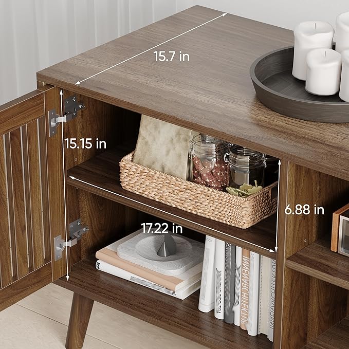 - 【Built to Last with Premium Materials】Crafted from durable materials and supported by sturdy solid wood legs, this TV console is built for everyday use. Adjustable legs provide added stability, ensuring it can safely hold all your media equipment and accessories.