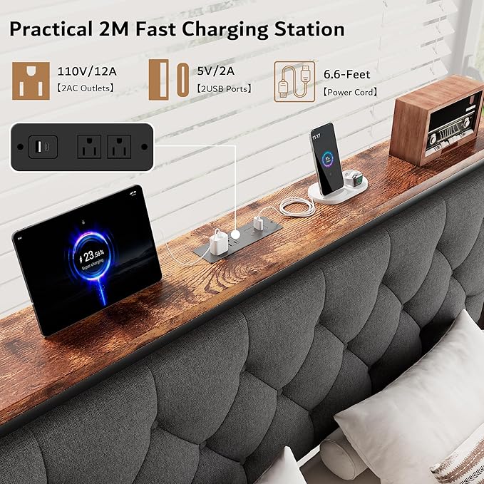 - Charging Storage Headboard: The integrated charging station includes 2 outlets, 1USB port, and 1 Type-C port for all your device-charging needs. Equipped with sturdy, waterproof wooden platform fits snugly against the wall