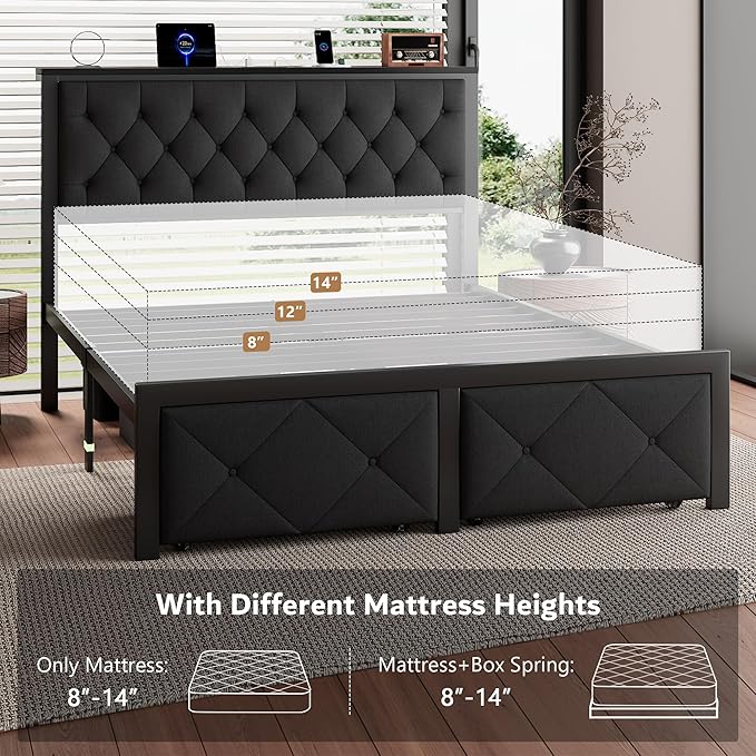 iPormis Queen Bed Frame with 2 Storage Drawers, Linen Upholstered Headboard Platform Bed with Charging Station, No Box Spring Needed, Metal Slats Support, Noise-Free, Easy Assembly, Black