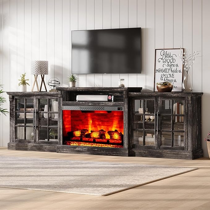 97" Farmhouse TV Stand with 33" Fireplace for TVs up to 100", Media Entertainment Center with Large Storage Cabinet and Adjustable Shelves for Living Room, Rustic Black