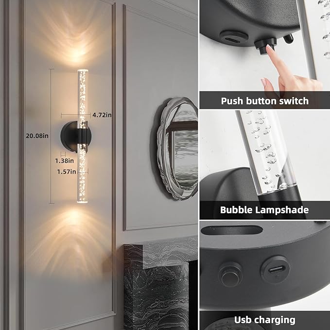 - Unique Acrylic Bubble Lamp Post: Sconces wall decor set of 2 wireless features a frosted metal black finish with a high translucent acrylic round post, mimicking the appearance of crystal bubbles encased in ice.highlights the high quality of the wall sconces fixture. LED Chip reflect unique light effects, This design offers a distinctive visual experience, enhancing the ambiance of any space.