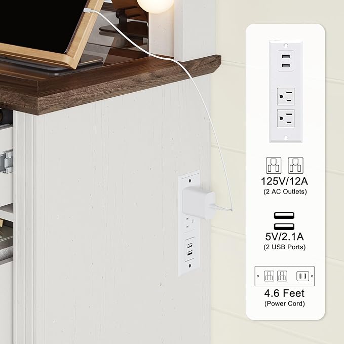 - Charging Station: This vanity desk comes equipped with 2 outlets, 2 USB ports, making it easy to charge your devices and use beauty tools like hair dryers directly from your dressing table