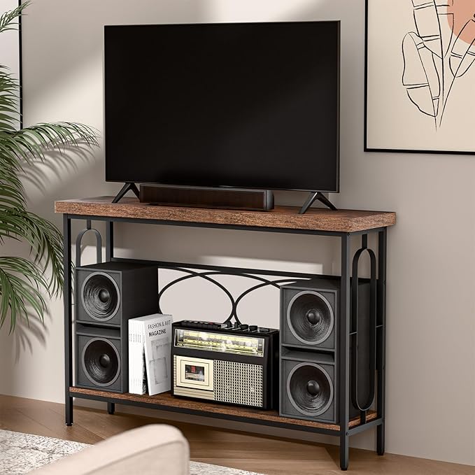 - [Simple Design]: The minimalist sleek design adds an industrial chic touch to this sofa table, bringing a sophisticated country style to any space. The versatile look makes this console table perfect for use as a TV console or long horizontal bookshelf. Meet all your display and storage needs