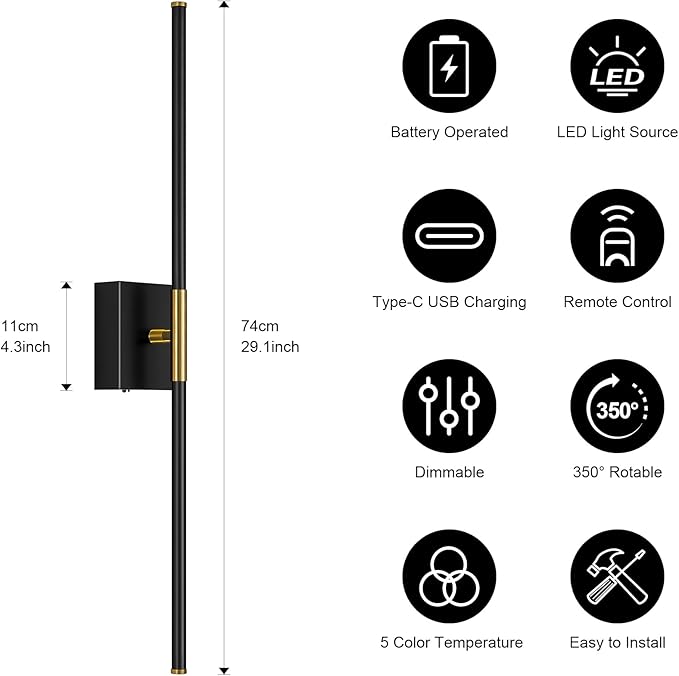 Wall Sconces Set of Two with Remote Control 29.1 in Dimmable Black Gold Battery Operated Wall Lights 350° Ratation 3000K-6000K LED Wireless Rechargeable Sconce for Bathroom Living Room Bedroom