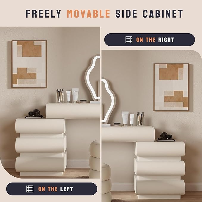 - 【Premium Materials】 - This modern vanity adopts a solid wood frame structure, silent sliding rails, and thickened panels. The high-quality materials not only eliminate any odors but also ensure they are harmless to the human body, while also increasing the overall durability.Side cabinet can be placed on the left or right according to your needs, soft PU stool makes every makeup time a pleasure and is comfortable even if you sit for a long time.