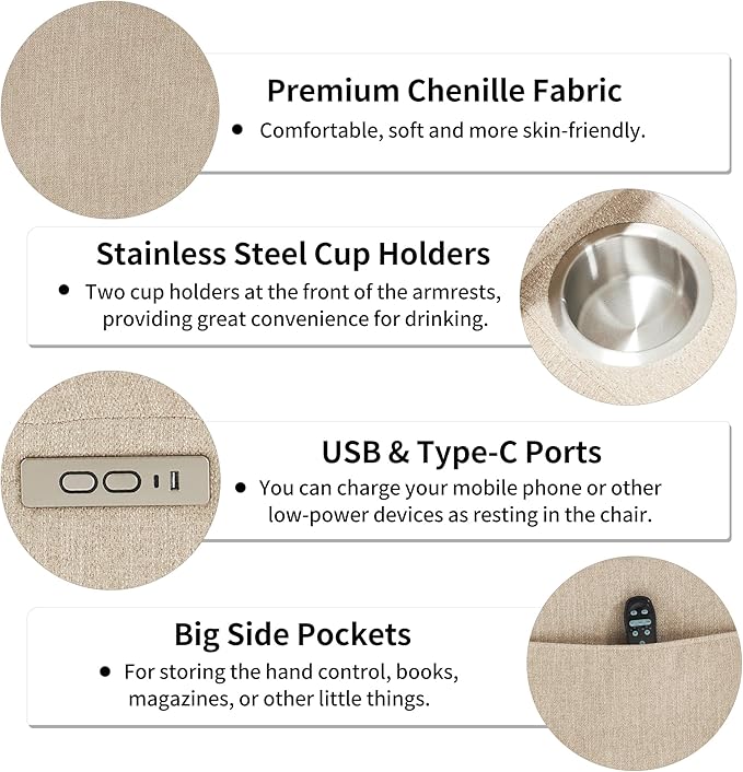 - Win in the Details: You can put your drinks in our 304 stainless steel cup holders, solid and heatproof. Meanwhile, side pockets also provide great convenience for storing books, magazines, or other small things.The USB and Type-C charging ports at the side of the recliner will allow you to charge your mobile devices while enjoying a movie or reading a book. (Notes: The USB and Tape-C ports are ONLY for low-power devices, such as mobile phones and min fans.)
