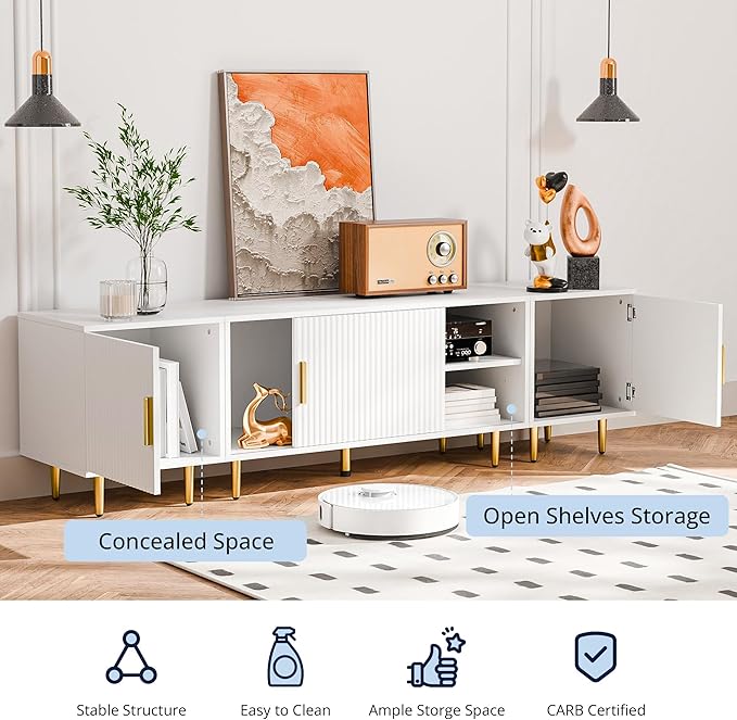 Cozy Castle 75" Modern Fluted Stand for TV up to 80", Mid Century Entertainment Center with Storage and Open Shelves, Media Console for Living Room, Bedroom, White