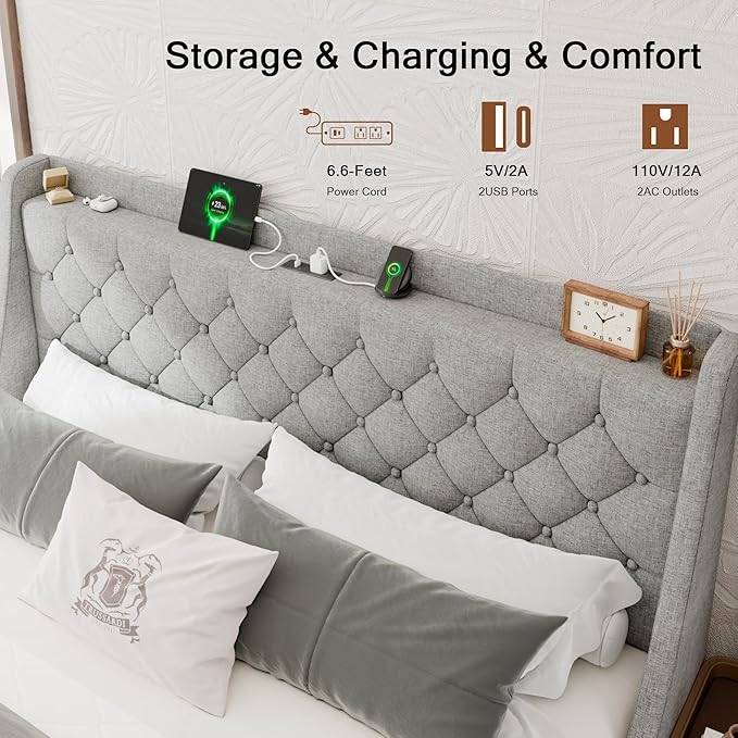 - Convenient Lifestyle within Reach: Keep your devices always accessible with the 20W Fast Charging Ports (Type-C & Type-A) and outlets. The storage shelf not only facilitates easy access to belongings but also serves as a canvas for you to decorate your headboard according to your passions.