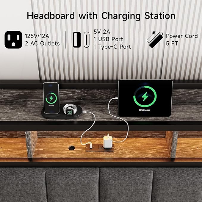 - HEADBOARD WITH CHARGING STATION: The upholstered headboard queen size is equipped with 2 standard plug outlets & 2 ports. You can easily charge your phone in bed without having to get up and look for an outlet