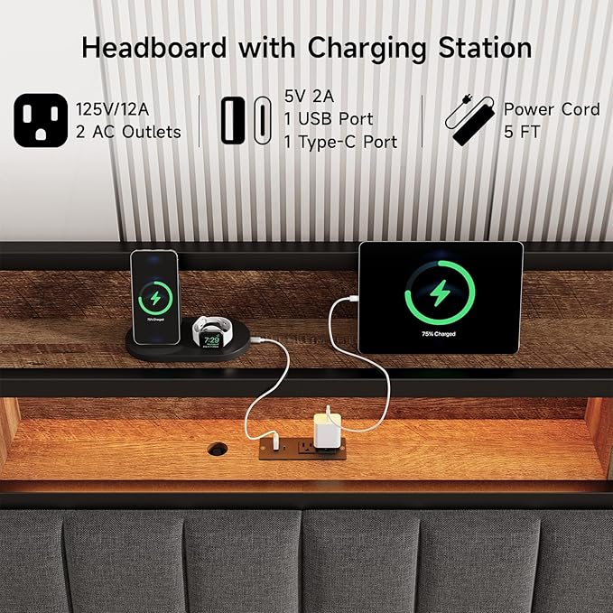 - HEADBOARD WITH CHARGING STATION: The upholstered headboard king size is equipped with 2 standard plug outlets & 2 ports. You can easily charge your phone in bed without having to get up and look for an outlet