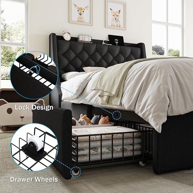 Twin Bed Frame with 4 Storage Drawers, Giant Upholstered Wingback Headboard, Fast Charging Station, No Box Spring Needed, Noise-Free, Black