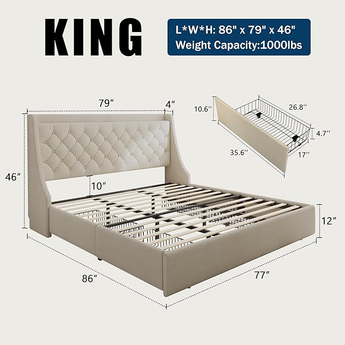 King Size Bed Frame with 4 Storage Drawers, Giant Upholstered Wingback Headboard, Fast Charging Station, No Box Spring Needed, Noise-Free, Beige