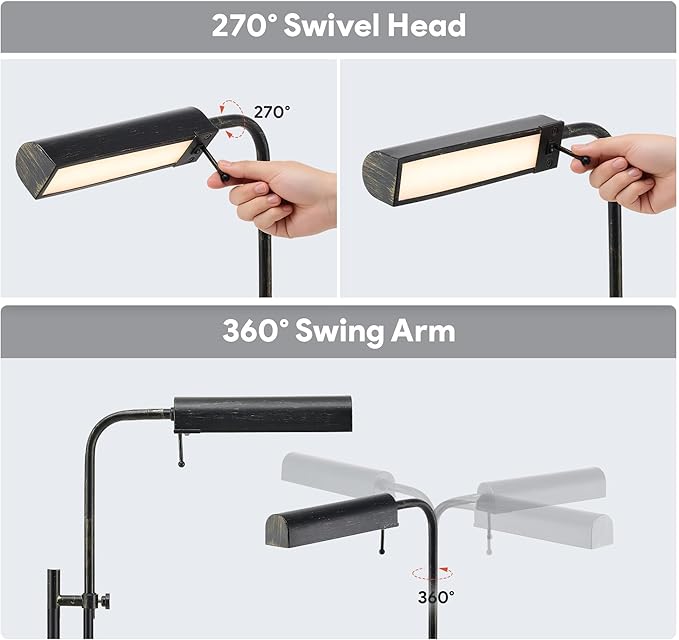 - Fully Adjustable Design: With an adjustable height ranging from 42.5" to 62.5", a 360° swing arm, and a 270° swivel head, this LED floor lamp is designed to meet all your lighting needs—from cozy reading nooks to office workstations
