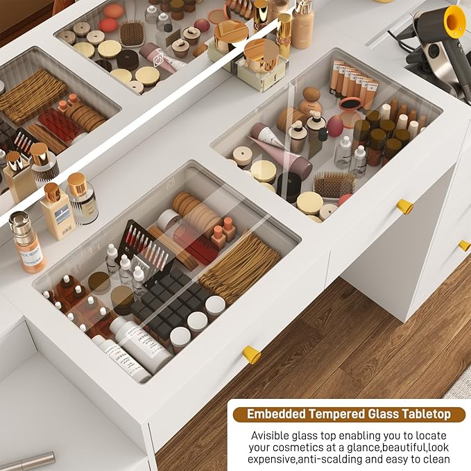 - Visible Transparent Glass Desktop : The clear glass desktop is not only stylish but also allows you to effortlessly see all your cosmetics and tools. The smooth surface is easy to clean, ensuring your makeup area remains tidy and elevating your overall user experience.