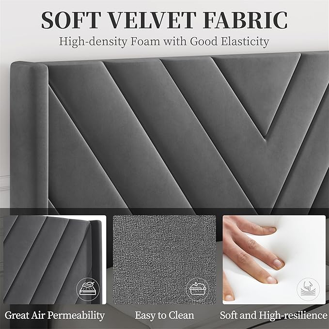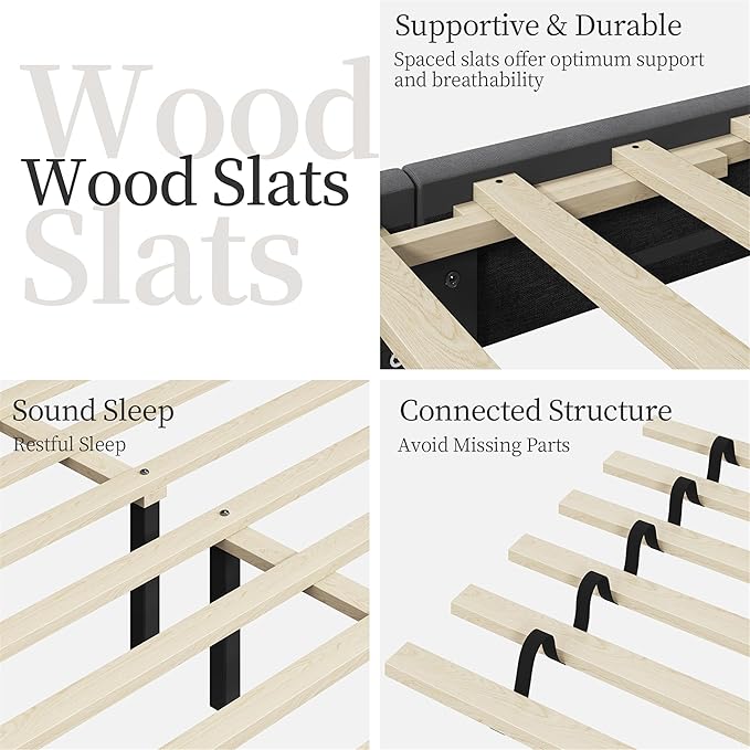 - Headboard With Wing Design: The upholstered platform bed is designed with a wing side on the wide upholstered headboard, which locks into place to prevent slipping and mattress movement. (No Box Spring Needed)