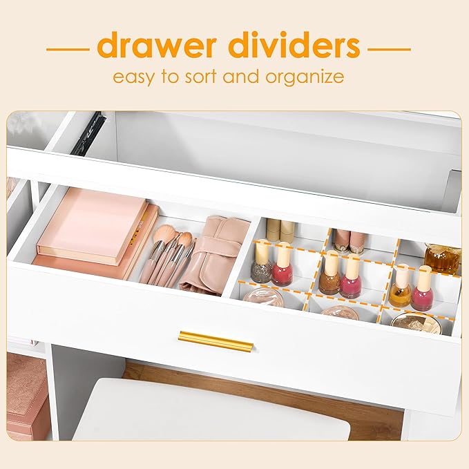 - 【GLASS TOP & DRAWER DIVIDERS】The white vanity with lights features a distinctive large glass table top of, allowing for a clear view of the beauty tools and items stored in the drawers. Thoughtfully designed drawer dividers facilitate easy categorization and organization of cosmetics, ensuring the womens vanity remains tidy and orderly. This vanity with mirror and lights, allows you to locate your favorite items at a glance