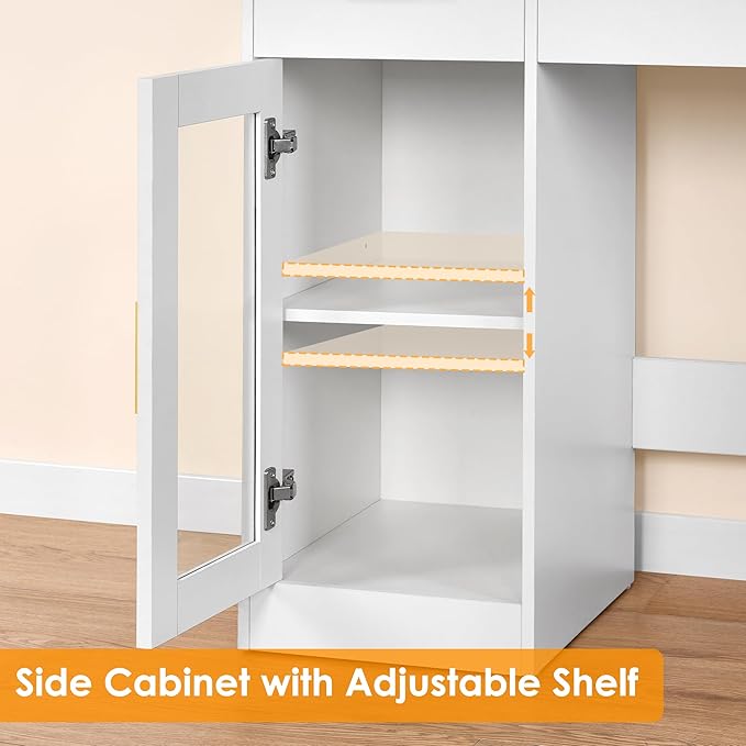 - 【POWERFUL STORAGE CAPACITY】The 49.2" large makeup vanity offers ample storage capacity. Its spacious tabletop and glass cabinets provide sufficient space for your frequently used makeup items. The dressing table has 5 drawers and, which can easily accommodate all your belongings. The white vanity glass top drawer, not only allows for DIY drawer dividers but also enables you to quickly locate the makeup or jewelry you desire