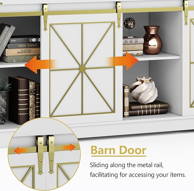 - 【Sliding Barn Doors & Cable Management】Two sliding barn doors on tv console for convenient access to cabinets and shelves. The movable metal rails ensure smooth and noiseless movement. Two Holes on the back allow cables from various devices to pass through. The cable management system keeps your wires hidden to ensure a clean and tidy appearance