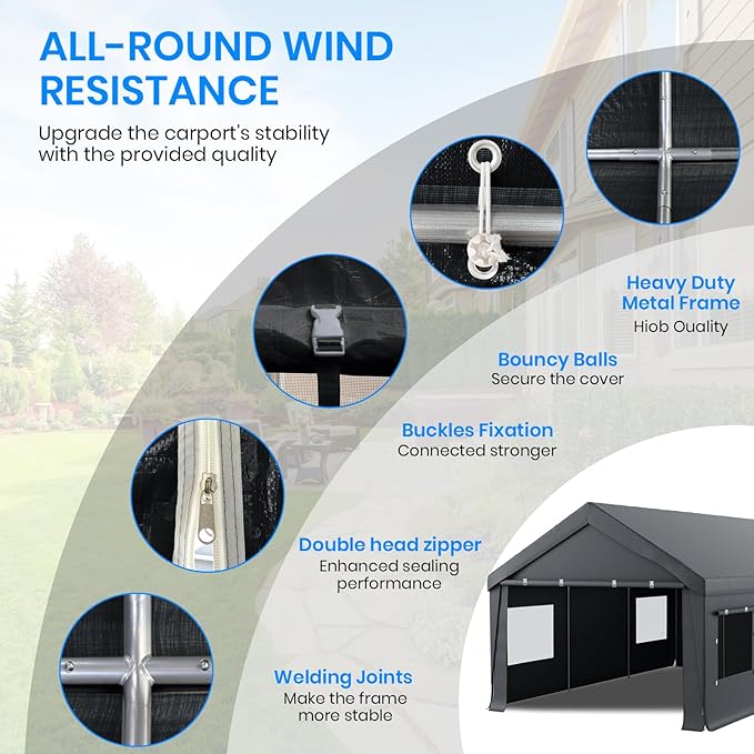 - 【Heavy Duty Stability Frame】This carport shelter is constructed with a rust-resistant galvanized steel frame that prevents rust, and corrosion. Featuring 8 legs comprising thick steel poles, 4 sturdy windproof ropes and 16 ground stakes make the portable garage 12x20 heavy duty can be safe from harsh weather conditions(Extra sandbags are recommended in high winds)