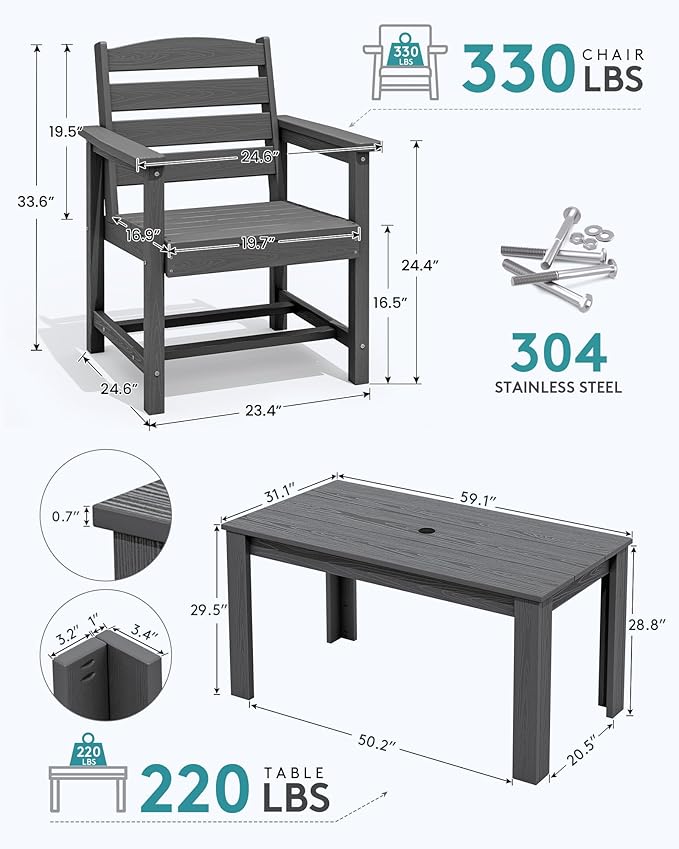 - 【Outdoor Dining Set for 6】This outdoor dining set contains 1 rectangular dining table and 4 hdpe dining chairs. The modern patio dining sets providing a complete and coordinated ensemble for your outdoor dining area.