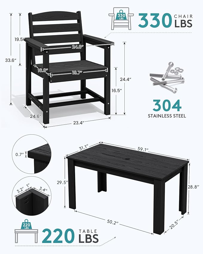- 【Family-Friendly】HDPE patio dining table sets are family-friendly, providing a comfortable and safe space for outdoor meals and gatherings. Its rounded edge is safer than the steel material, making it ideal for families with children.