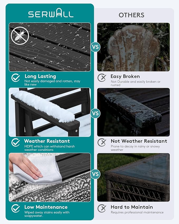 - 【Low Maintenance】HDPE dining table sets required low maintenance. Unlike the Steel dining sets may require rust prevention, SERWALL patio dining table and chairs are easy to clean with just soap and water, requiring minimal effort to keep them looking fresh.