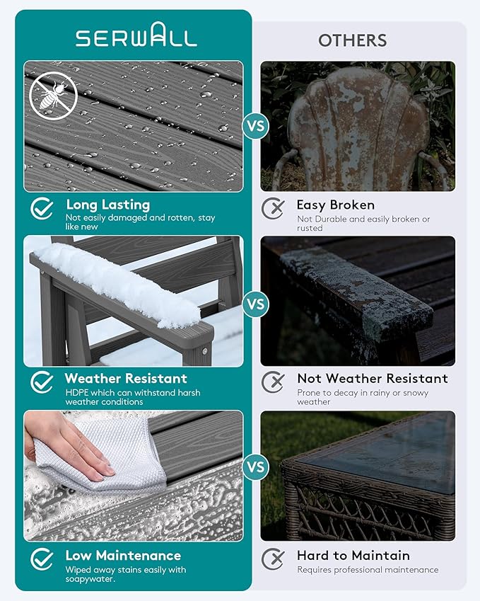 - 【Low Maintenance】HDPE dining table sets required low maintenance. Unlike the Steel dining sets may require rust prevention, SERWALL patio dining table and chairs are easy to clean with just soap and water, requiring minimal effort to keep them looking fresh.