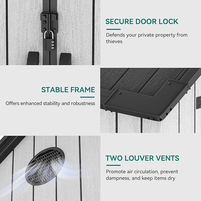 - Secure and Weatherproof: Our plastic shed features a lockable door and waterproof design, ensuring your tools and equipment stay safe from theft and harsh weather conditions; Ideal for those seeking a long-term storage solution