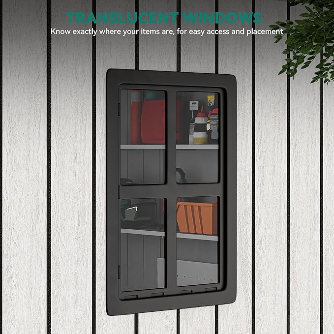 - Bright and Airy: Enjoy natural light and air circulation with ventilation holes and a semi-transparent window design, making this large resin shed a good choice for storage; The double doors are wide for easy entry and exit of stored items