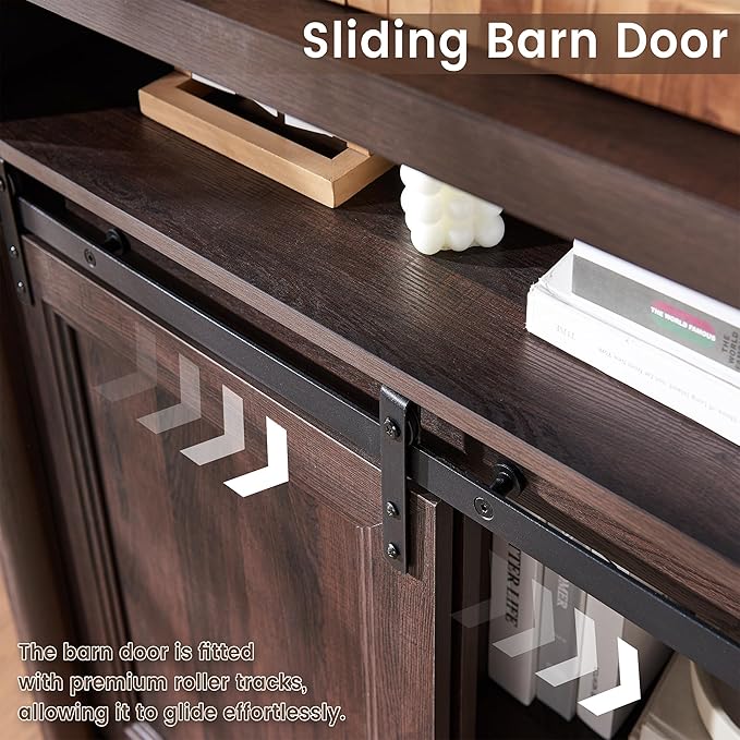 - Sliding Barn Door Design: Featuring two rustic sliding barn doors with metal handles and smooth steel guides, this piece adds a touch of countryside charm while providing easy access to storage cabinets or shelves. It’s not just a TV stand—it’s a versatile storage cabinet too!