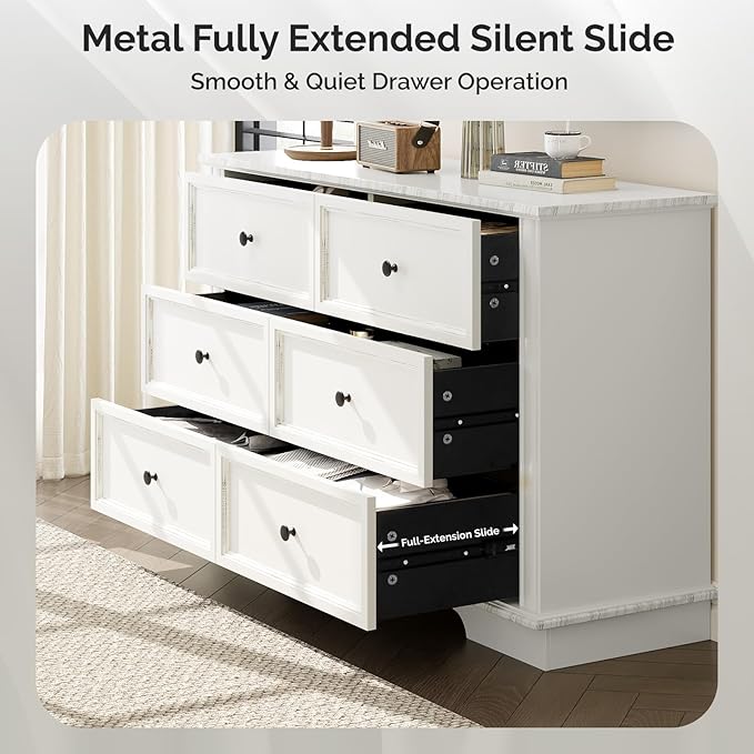 - 【Metal Full-Extention Silent Slide】Equipped with quality three-section soft-close drawer slides to allow drawers to open and close effortlessly and quietly, making it a breeze to access your items. They prevent the drawers from slamming shut, which is not only noise-reducing but also helps prolong the life of the dressers.
