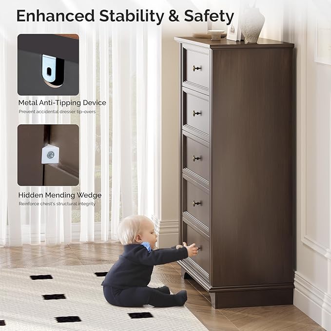 VINGLI 47" Tall Dresser 5 Drawer Chest of Drawers, Wood Dresser for Bedroom, Brown Chest Dressers Wooden