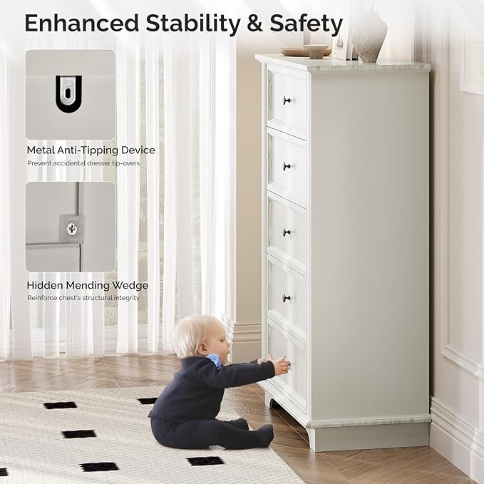 VINGLI White Dresser, 47" Tall Dresser Wood, 5 Drawer Dressers for Bedroom, White Chest of Drawers
