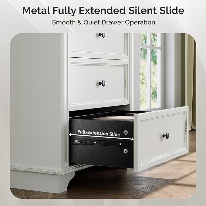 - 【Metal Full-Extention Silent Slide】Equipped with quality three-section soft-close drawer slides to allow drawers to open and close effortlessly and quietly, making it a breeze to access your items. They prevent the drawers from slamming shut, which is not only noise-reducing but also helps prolong the life of the dressers.