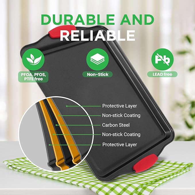 - SAFE AND EASY HANDLING - Equipped with ergonomic silicone handles, these cookie pan sets are safe to grip and handle without risk of slipping. Heat-resistant up to 446°F, they're perfect for oven-to-table convenience.