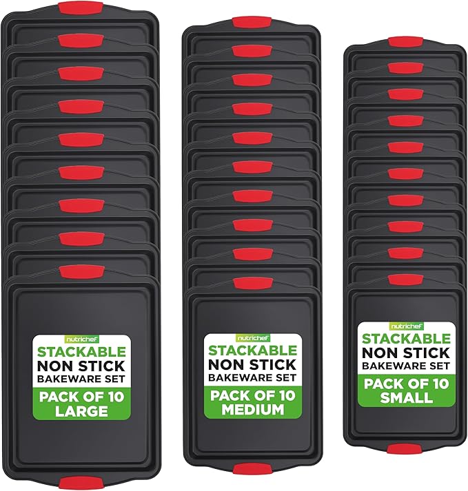 NutriChef Nonstick Baking Pans Set – Premium Cookie Sheets for Baking, Carbon Steel Stackable Baking Trays with Red Silicone Handles, Oven Safe Pans for Cookies, and Cakes, Dishwasher Safe (30 Pack)