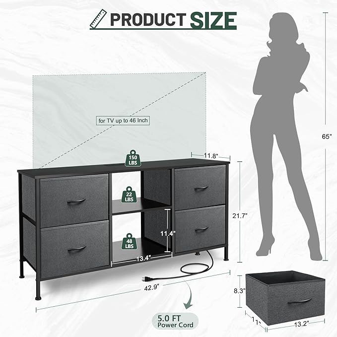 - Dimension - The tv stand dimensions: 42.9"L x 11.8"W x 21.7"H, which is ideal for TV up to 46 inch. Fabric drawer dimensions: 13.2" L x 11"W x 8.3" H. This tv stand for bedroom comes with detailed instructions and all hardware needed, it is easy to assemble.