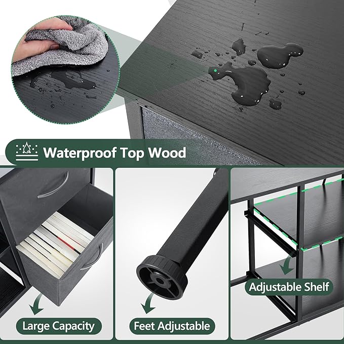 - Durable Material - This tv table is made of non-woven synthetic fiber, harmless and wear-resistant. Strong steel frame and water-resistant wood top offer stable support. Easy-pull drawers with plastic handles for smooth opening and closing.