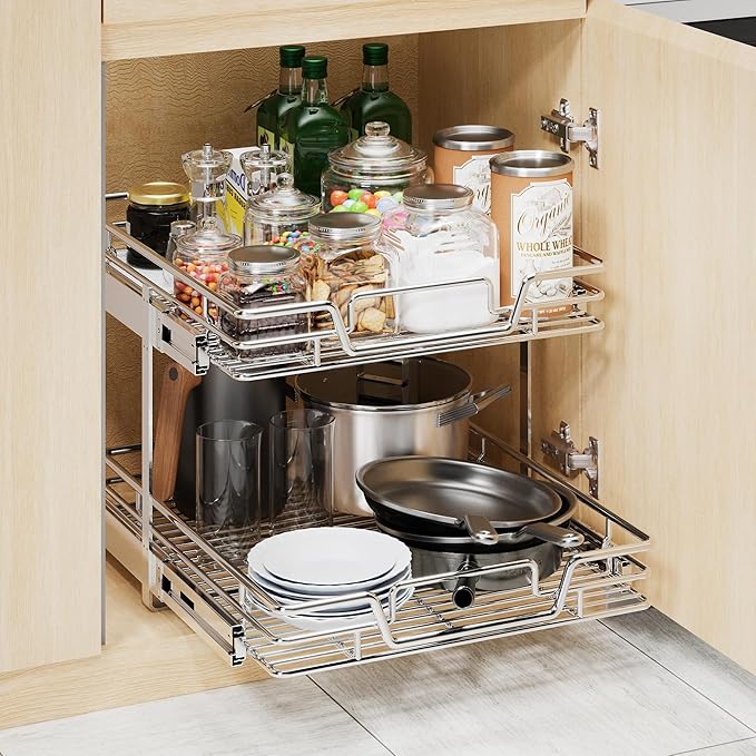 - DOUBLE SHELVES PULL OUT INDIVIDUALLY: 2 tier pull out cabinet shelf is a convenient and practical storage solution that helps you make the most of your cabinet space. This shelf can hold pots and pans, kitchen mixers, food jars, cleaning supplies, spice racks and other items, effectively saving storage space.