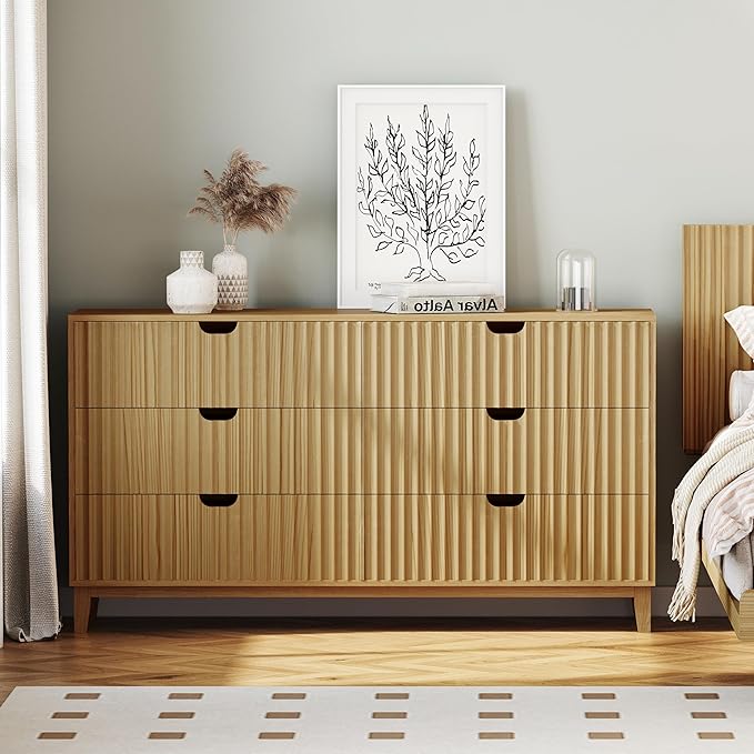 Fluted Dresser for Bedroom 6 Drawer, 58" Wide Large Wood Dresser, Chest of Drawers for Bedroom, Living Room, Hallway, Entryway, Modern TV Stand Drawer Organizer, Natural