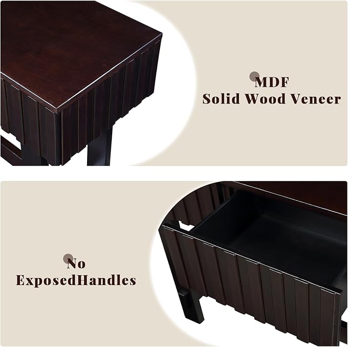 - Handle-less Design: The elegant handleless design blends seamlessly into the overall aesthetic of this sofa table. Each drawer is equipped with 1 smooth slides on bottom that ensures a quiet and effortless opening and closing motion. This innovative design not only enhances the minimalist look but also provides a practical solution for easy access to your belongings, making it a perfect fit for any modern living space.