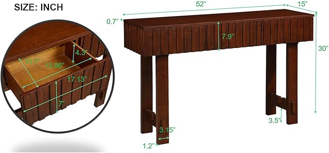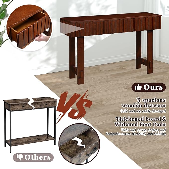 52" Console Table, Solid Wood Fluted Sofa Table Behind The Couch, Mid Century Farmhouse Entryway Table with 3 Drawers for Entrance, Hallway, Living Room, Foyer (Cherry)